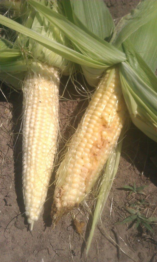 I ran a bit of experiment this year and planted both non-GM and GM sweet corn. We wanted to see first-hand if it was worth the extra expense. The GM sweet corn seed is about three times more expensive than the current non-GM seed we plant. However, it is tolerant to the herbicide glyphosate and contains the Bt gene, which allows the plant to produce a natural pesticide that protects the crop against several pests, including the nemesis of any sweet corn producer, the corn earworm. It ensures that this doesn’t happen (note the ear on the right with earworm damage):