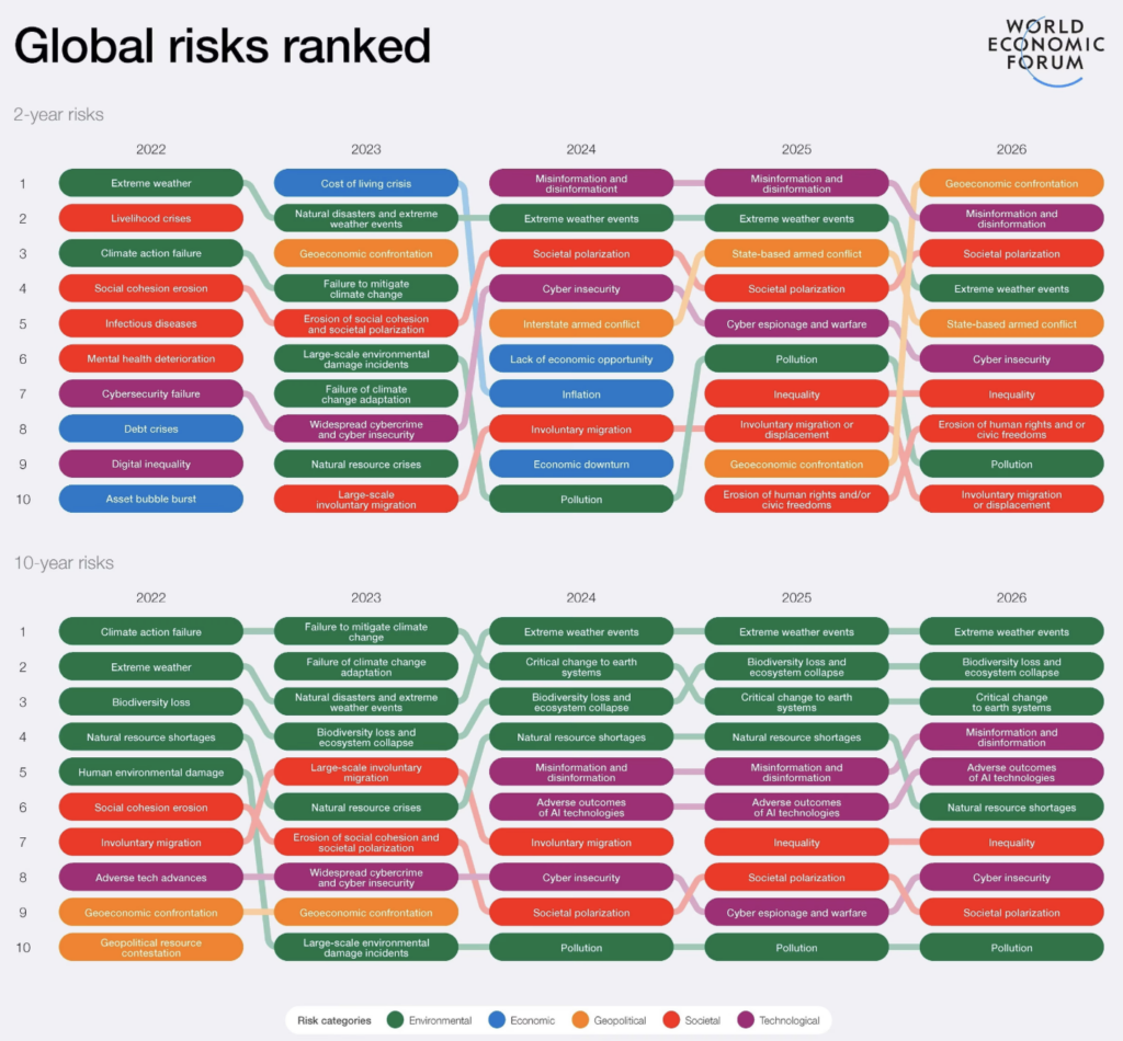 The World Economic Forum’s Global Risks Report 2026 placed mis‑ and disinformation among the top short‑term global risks, alongside geoeconomic confrontation and societal polarization. It is one of the few risks that remains severe over both the two‑ and ten‑year horizons and is seemingly the risk that catalyses or worsens all other risks on the list.
